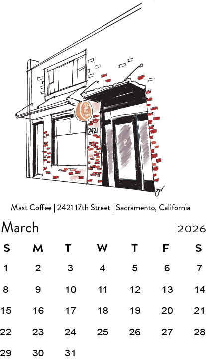 Part of Priya Originals Art's 2026 calendar collection, celebrating Sacramento's Third Places—where community happens over great coffee.