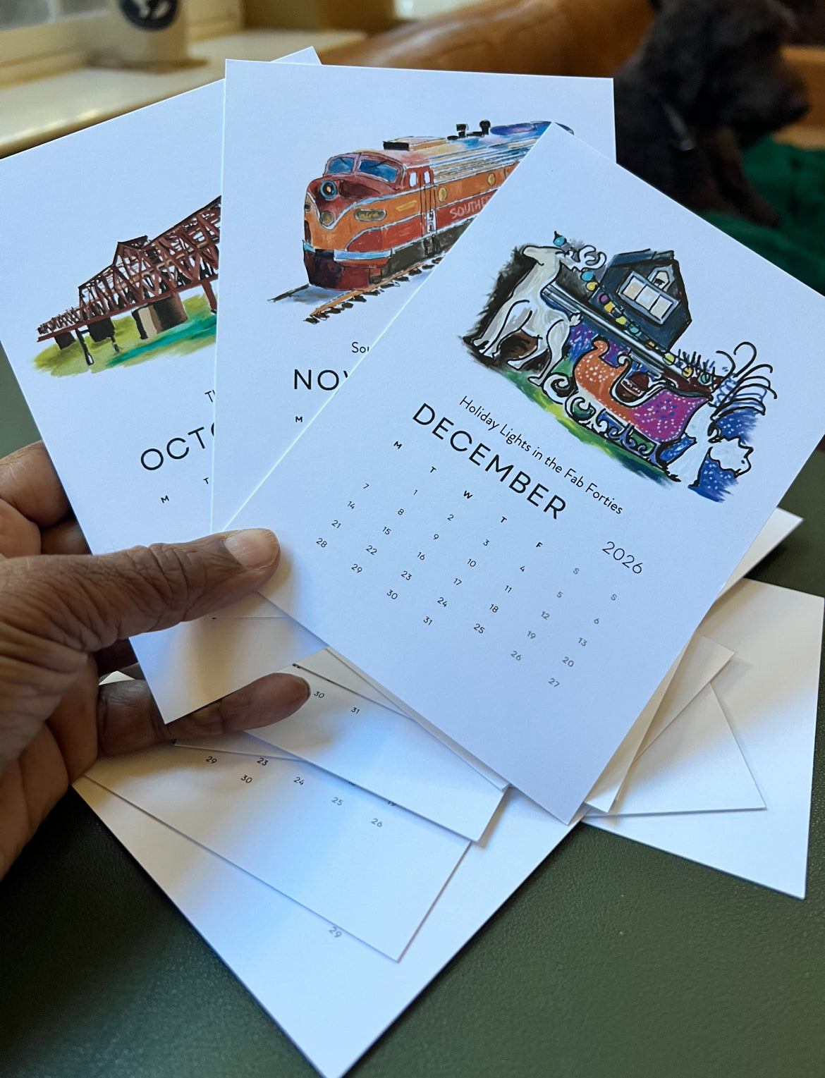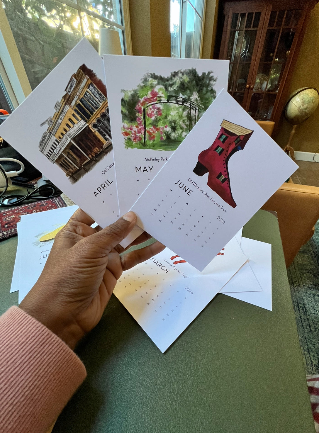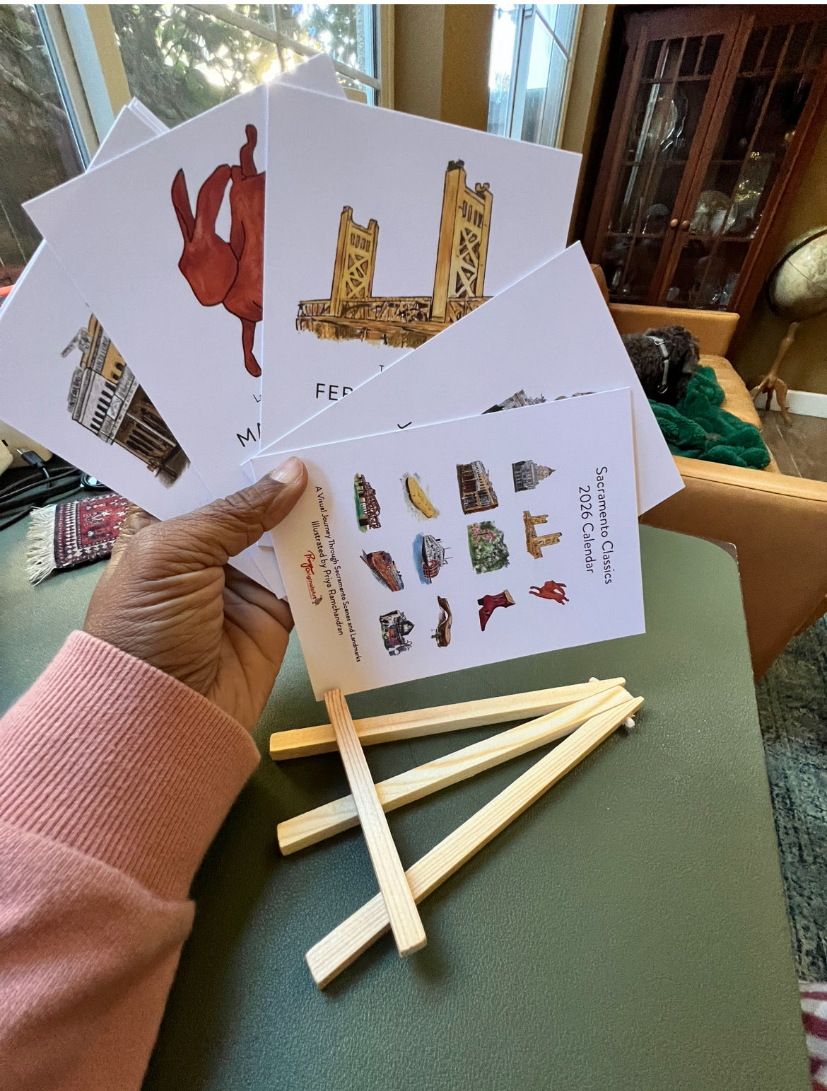 Displayed on an adorable mini wooden easel, this compact calendar is perfect for desks, shelves, nightstands, or kitchen counters. The detailed illustrations capture the city's distinctive architecture and landmarks—celebrating what makes Sacramento special, one month at a time.